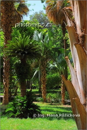 Nádherné palmy v botanické zahradě na Kitchenerově ostrově. Tu zde zřídil v 90. letech 19. století lord Kitchener, jenž dostal ostrov jako odměnu za to, že vedl egyptské vojsko v úspěšném tažení do Súdánu. Asuán, Egypt.