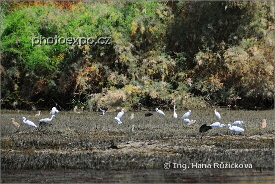 Volavky a další ptactvo jsme míjeli při plavbě člunem mezi Kitchenerovým ostrovem a núbijskou vesnicí. Nil, Egypt.