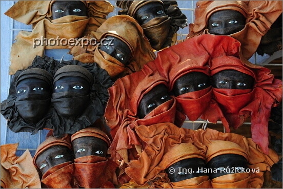 Ručně vytvořené masky zdobené kůží v núbijské vesnici na ostrově Sehel. Egypt