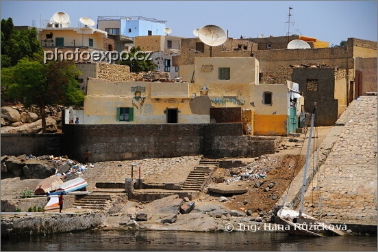 Odpadky, potopená feluka, rozbořené i rozestavěné domy, satelity a musimská dáma s magnetofonem na hlavě. Pravda, pouze jako kresba na domě :=) Egyptská realita. Asuán, Egypt.