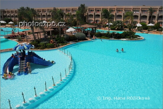 Hotel Prima Life Makadi***** v oblasti Hurgada mi byl zázemím při příjezdu do Egypta a zase pak odjezdu. Rozsáhlý areál nabízí mj. členitý bazén, bary i vlastní pláž. Denní pohled. Egypt