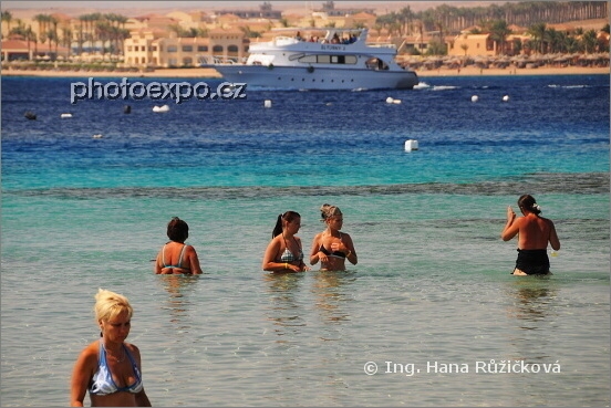 Lidé v mělkých vodách u pláže hotelu Hotel Prima Life Makadi***** v oblasti Hurghada. Egypt