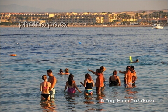 Lidé v mělkých vodách u pláže hotelu Hotel Prima Life Makadi***** v oblasti Hurgada. Egypt