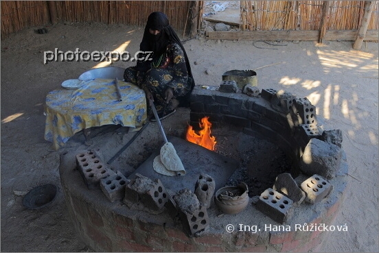 Beduínská žena připravuje chléb-placku. Egypt