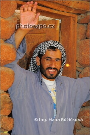Beduín v typickém šátku, který v Egyptě potkáte na každém rohu. Beduínská vesnice, Egypt.