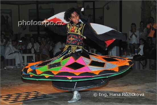 Fascinující taneční výkon mladinkého derviše jsme mohli sledovat při folklorním tanečním večeru po návratu z beduínské vesnice. Egypt
