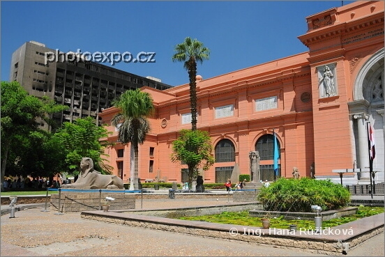 Zahrada a okolí areálu Egyptského muzea v Káhiře. Zahrady kolem muzea nabízejí ke shlédnutí různé historické sochy. Velká budova po požáru (vlevo od muzea) byla údajně sídlem strany Husního Mubaraka, tak ji v průběhu "revoluce" vypálili bez ohledu na to, že od ní mohlo chytit blízké muzeum schraňující mnohé z nejcennějších světových historických pokladů... Káhira, Egypt.