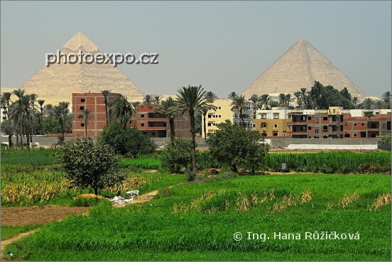 Historické vedle nového, starobylá architektura sousedící s tou moderní... Ano i takovéto a mnohé jiné zajímavé pohledy se naskytnou při cestě Káhirou k pyramidám v Gíze. Vpravo je velká Cheopsova nebo také Chufuova pyramida, vlevo, se zachovalou špičkou, pak Chefrenova či také Rachefova pyramida. Káhira, Egypt.