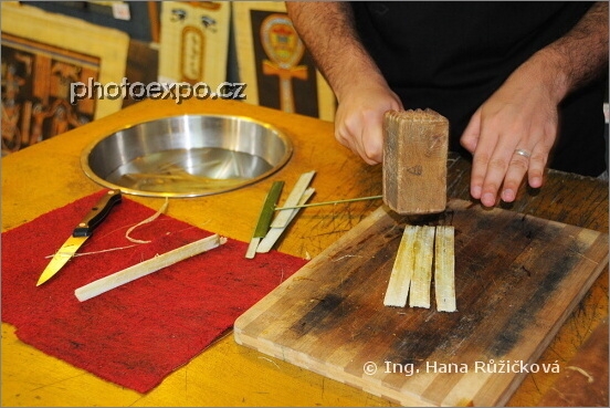 Ukázka výroby papyru: 1) oloupaný a na plátky nařezaný stvol šáchoru aneb papyru se rozklepe paličkou. Egypt