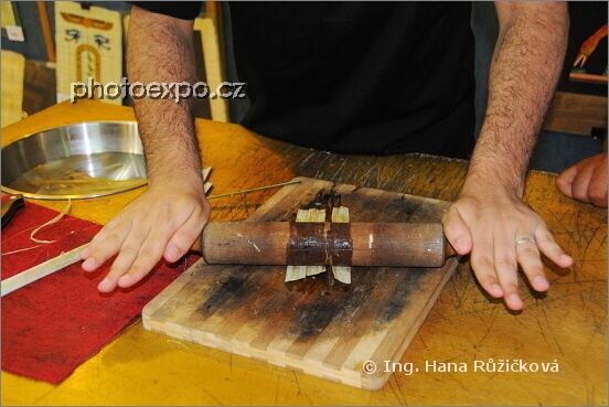 Ukázka výroby papyru: 2) naklepané plátky stvolu papyru se ještě rozválí válečkem. Egypt
