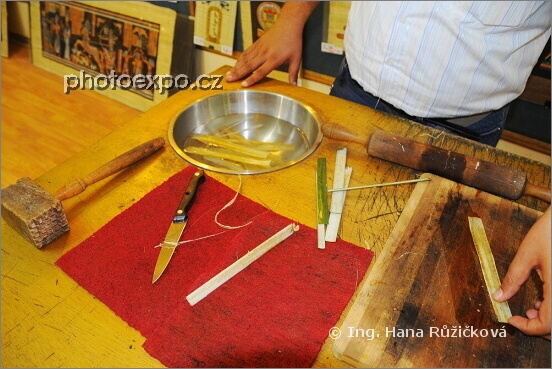 Ukázka výroby papyru: 3) rozklepané a rozválené plátky papyru se namočí do vody - čím déle, tím kvalitnější papyrus. Egypt