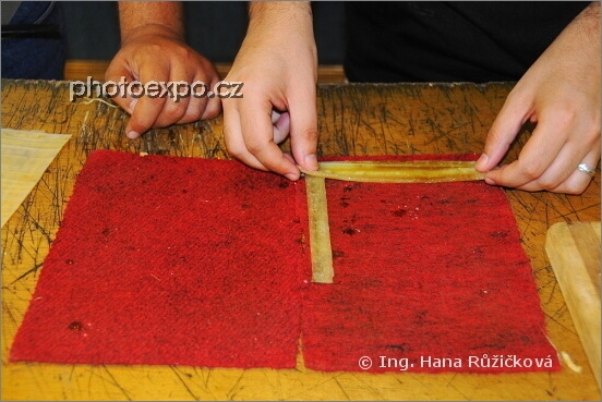 Ukázka výroby papyru: 4) rozklepané, rozválené a namočené plátky papyrového stonku se poskládají k sobě tak, aby vznikla souvislá vrstva, základ papyrového archu - a ta se pak slisuje. Egypt