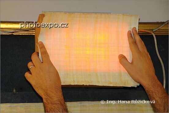 Ukázka výroby papyru: 5) Po slisování nastává kontrola kvality papyrového archu. Egypt