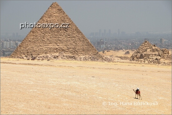 Nejmenší ze tří známých pyramid v Gíze, Menkaureova pyramida, na pozadí gigantické Káhiry. Tento pohled mě fascinoval. Egypt