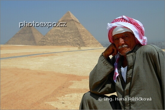 Starý Egypťan u pyramid v Gíze. Mohla bych si hrát na úžasný jedinečný a romantický záběr, ale realita je taková, že na vyhlídkové plošině nad pyramidami čeká více takových naturálních Egypťanů na svůj výdělek. Ten si \"zasluhují\" svým zapózováním na pozadí pyramid. Kvalita snímku už je ale zcela na jejich pořizovateli :=) Vlevo je větší, Cheopsova či Chufuova pyramida, vpravo se zachovalou špičkou pak Chefrenova aneb Rachefova. Gíza, Egypt.