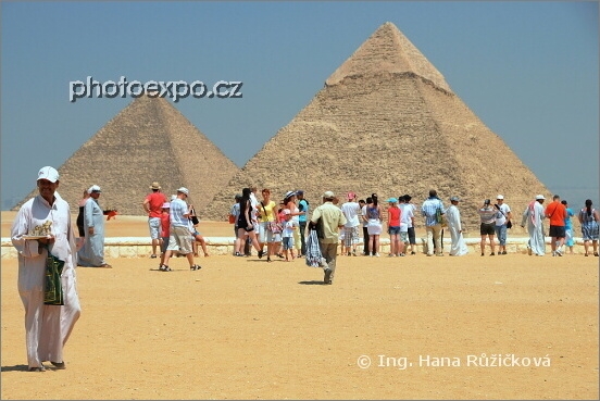 Turisticko-egyptská mela na vyhlídkové plošině nad pyramidami v Gíze. Vlevo zdánlivě menší je Cheopsova čili Chufuova pyramida, vpravo se zachovalou špičkou pak Chefrenova aneb Rachefova. Pyramidy vypadají jakoby byly na dosah lidem. Tuto zajímavou pespektivu vytvořil teleobjektiv, kterým jsem si plošinu a pyramidy přiblížila. Pyramidy jsou poměrně daleko a z plošiny se k nim jezdí auty. Gíza, Káhira, Egypt.