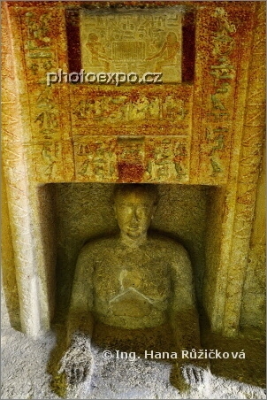Hrobka Idua, královského písaře z 6. dynastie, a jeho socha. Hrobka se nachází v komplexu gízských pyramid. Káhira, Egypt.