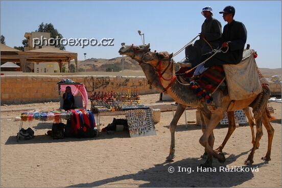Takovéto snímky miluji. Dokumentární, kompozičně zajímavé, s příběhem... Cestou ke Sfinze jsem míjela dívku, která prodávala suvenýry vystavené na stolcích podél turistické cesty vedoucí k monumentu, ale zrovna ji turisté nezajímali... Zajímal ji telefon a byla plná radostných emocí. Do toho mi vjeli dva Egypťané na svých velbloudech. Dnes už asi na turistech vydělali dost, tak hurá domů. Gíza, Káhira, Egypt.