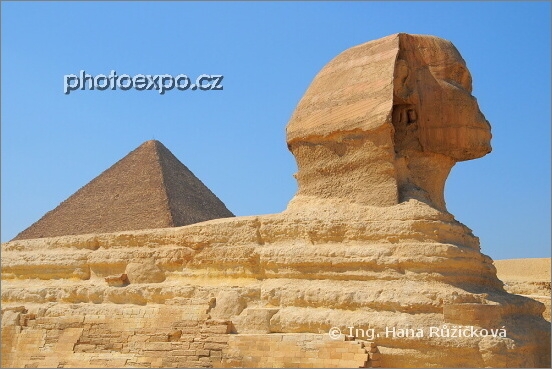 Tak to je ona, Sfinga, na pozadí Cheopsovy aneb Chufuovy pyramidy. Nejpamátnější známá monumentální socha starověkého Egypta datovaná do doby kolem roku 2500 př.n.l. Její obličej patří pravděpodobně samotnému Rachefovi (Chefrenovi), který ji nechal vybudovat do výšky 20 m. Za dlouhou dobu života Sfingy z ní již leccos upadlo, třeba nos nebo stylizované vousy, symbol královského úřadu. Gíza, Káhira, Egypt.