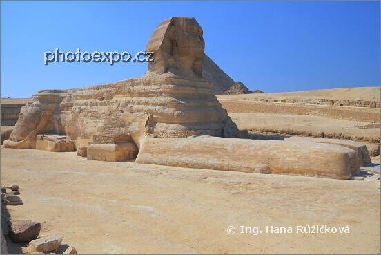 Tak to je ona, nádherná Sfinga se lvím tělem. Nejpamátnější známá monumentální socha starověkého Egypta datovaná do doby kolem roku 2500 př.n.l. Její obličej patří pravděpodobně samotnému Rachefovi (Chefrenovi), který ji nechal vybudovat do výšky 20 m. Za dlouhou dobu života Sfingy z ní již leccos upadlo, třeba nos nebo stylizované vousy, symbol královského úřadu. Gíza, Káhira, Egypt.