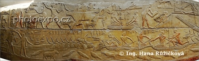 Neupravené a neoříznuté panorama reliéfů z Kagemniho hrobky v Sakkáře. Panorama je poskládáno ze 3 fotografií a může Vám poskytnout představu o nádherné výzdobě egyptských hrobek. Sakkára, Egypt.