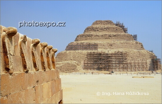 Stupňovitou Džoserovu pyramidu vybudoval ve 27. století před Kristem pro krále Džosera jeho stavitel, kněz Imhotep. Je to vlastně první egyptská pyramida. Do té doby se budovaly hrobky v podobě podzemních komor pokrytých nízkými mastabami z vepřovic. Novátor Imhotep použil kámen a navršil na sebe hned šest mastab spočívajících jedna na druhé. Od té doby se v Egyptě začaly budovat klasické pyramidy. Vlevo je vlys znázorňující kobry. Sakkára, Egypt.
