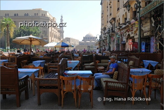 Kavárny a restaurace na náměstí Midán al-Husein. Vlevo vzadu jsou věže mešity Al-Azhar, vpravo vzadu pak kupole mešity Abú Dahaba. Mešita za mnou, mešita přede mnou... Káhira, Egypt.