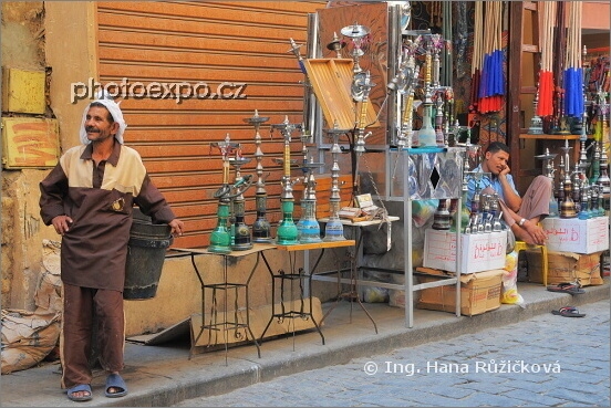 Někdo je vysmátej a někdo unuděnej. A zákazníci nechtějí a nechtějí kouřit. Prodejna vodních dýmek v ulicích Káhiry. Egypt