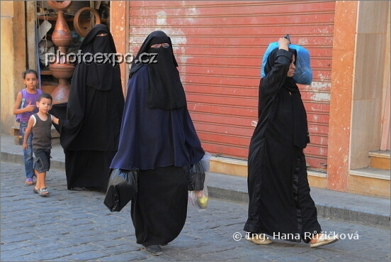 Ženy islámu v káhirských ulicích. I jen dostatek prostoru pro brýle chybí. No, upřímně, jsem ráda za svou svobodu pohybu a tudíž i svobodu v oblékání. Káhira, Egypt.