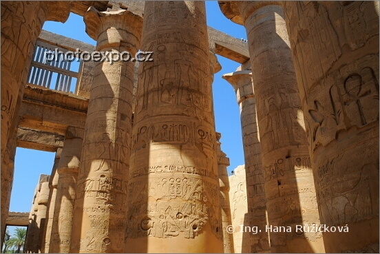 Fascinující sloupy plné reliéfů ve Velké sloupové síni Amonova chrámu v Karnaku. Ipet-Isut aneb Karnacký chrámový komplex je zřejmě nejrozsáhlejším chrámovým komplexem, jaký kdy byl vybudován. Po etapách jej stavělo mnoho faraonů celých 1500 let! Jeho srdcem byl právě Amonův chrám s Velkou sloupovou síní aneb Velkým hypostylem se 134 obřími sloupy pokrytými bezpočtem reliéfů a rytin zobrazujících bohy, faraony, symboly... A já byla malinká, malinká... Karnak, Egypt.