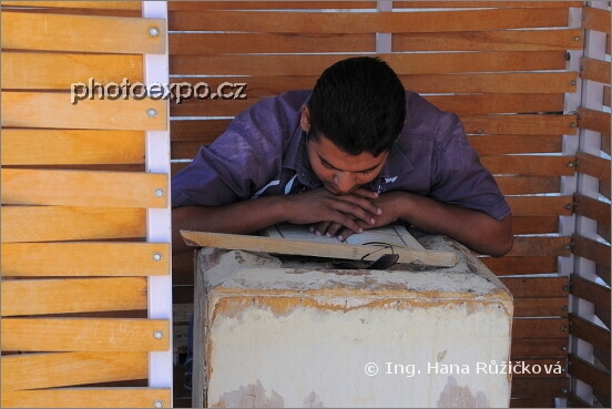 Náboženství nade vše. Pořekadlo platící zejména pro islámský svět. Egypt jsem navštívila v době ramadánu, nejvýznamnějšího muslimského svátku. A často jsem byla svědkem toho, jak výkon práce ustupoval čtení kapitol z Koránu. Každý den ramadánu mají totiž věřící povinnost přečíst konkrétní část této svaté knihy islámu. A tak jsem viděla například šéfa policejní ochrany u Velkého obelisku, jak se místo ostražitosti věnoval čtení Koránu. Chlapík ve stínu Lomené pyramidy byl rovněž místo vydělávání peněz prostřednictvím svého velblouda ponořen do kapitol svaté knihy. Taktéž náš průvodce cestou z Hurghady do Káhiry se místo nám věnoval Koránu. A i tento zástupce ostrahy Karnackého chrámového komplexu zíraje do posvátných řádků, vůbec nevěděl, co se kolem něj děje... Kdo ví, jestli by si vůbec všimnul, kdyby se tu střílelo...:=)) Karnak, Egypt.
