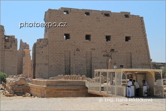 U každé významnější historické památky v Egyptě musíte projít kontrolou a rentgenem. Tedy pokud strážci památky zrovna nedávají přednost spánku nebo letargii. U největšího chrámového komplexu všech dob momentálně vítězí letargie a vypnuté rentgeny. V pozadí první pylon a před ním alej sfing. Ipet-Isut aneb Karnacký chrámový komplex je zřejmě nejrozsáhlejším chrámovým komplexem, jaký kdy byl vybudován. Po etapách jej stavělo mnoho faraonů celých 1500 let! Egypt
