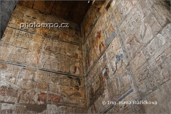 Dosud částečně barevené reliéfy uvnitř Luxorského chrámu. Měl by tu být mj. zobrazen Alexandr Veliký s obnaženým hrudníkem, zvednutým cepem, s impozantní korunou a hranatou sukní, jak uctívá boha Amona. Luxor, Egypt