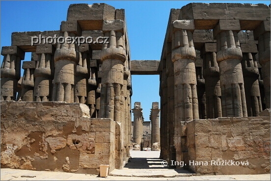 Hypostyl Luxorského hrámu sestává ze čtyř řad osmi papyroformních sloupů a průhledem mezi jeho sloupy je vidět na Velkou procesní kolonádu. Papyrus byl symbolem Dolního Egypta. Luxor, Egypt.