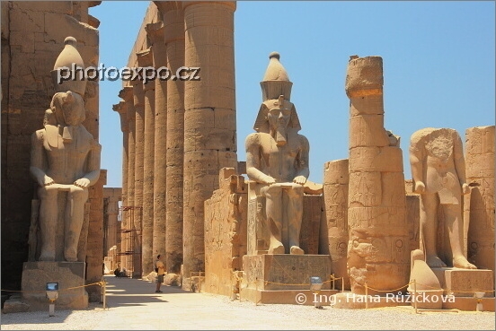 Velké nádvoří Ramesse II. se sloupy s hlavicemi ve tvaru papyrusových poupat (papyroformní), sochami Ramesse II. (Ramsese II.) a Velkou procesní kolonádou lemovanou sloupy. A člověk je táááákhle malinky...:=) Luxorský chrám, Luxor, Egypt.