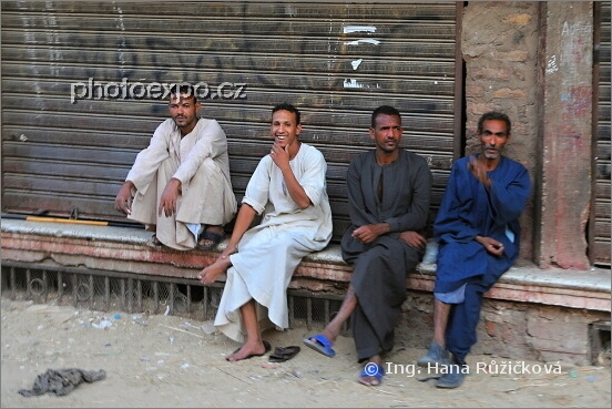 Příznivci ostrých či přeostřených fotografií ohrnou nos... Ale, jak řekl jeden náš významný fotograf: "Fotografie má splňovat různé aspekty, ale ostrost to není". Tyto chlapíky posedávající na ulici, jsem fotila za šera z drožky jedoucí poměrně velkou rychlostí ulicemi Luxoru. Právě i díky částečnému zajímavému rozostřední má, dle mého názoru, fotografie úžasnou atmosféru a dokumentární hodnotu. Za striktně ostrou bych ji rozhodně neměnila :=) Luxor, Egypt.