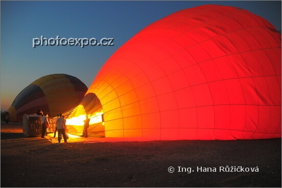 Tak to je on! Náš krásný červený balón se právě připravuje. A pak už jen hups do něj a letímeeeee. Nad Luxorem, nad Hatšepsutiným chrámem, nad poli, palmovými háji, vesnicemi, Nilem.... Egypt