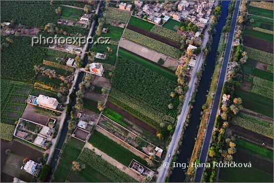 Krajina kolem Nilu pohledem z našeho horkovzdušného balonu. Bez vod Nilu by zde bylo mrtvo. Zavlažovací kanály distribuující životodárnou tekutinu do okolních vesnic, na políčka a do hájů, hustě protkávají krajinu kolem řeky řek. Úrodná půda se táhne až 20 km kolem Nilu. Pak je již jen poušť... Egypt.