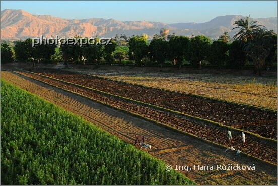 Ještě přeletět políčka právě opečovávaná místními muži... A přistáváme... Pěkně se zády ke směru letu skrčit v koši našeho horkovzdušného balonu. Buch! Trochu jsem se uhodila do zad. A už se trhaně suneme po poli. Nakonec si to náš balon uvelebil na jakési louce a my čekáme, až si pro nás někdo přijede. Luxor, Egypt.