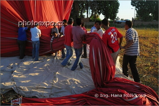 S naším horkovzdušným balonem jsme nakonec přistáli na jakési louce či políčku, kam si nás přijela vyzvednout grupa Egypťanů. Prvně se ale musí postarat o složení balonu. Takže rychle, než látka spadne na pole, rozprostřít jakousi bílou, špinavou, ochrannou látku na zem. Na tu nechat dopadnout látku balonu a pak ji hned začít srovnávat. A protože náš balon není žádný mrňous, ostatně v jeho koši mohlo být až 20 lidí (ale naštěstí nás bylo trochu méně), tak dává Egypťanům pořádně zabrat. Záhy mě chytají dvě silné egyptské ruce a vynášejí z koše balonu. Jojo, ne každý z účastníků má takový servis :=) Oblast Luxoru, Egypt.