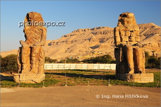 Memnonovy kolosy znázorňují faraona Amenhotepa III. a dosahují výšky 18 m. Každá socha byla vytesána z jednoho kusu kamene. Oblast Luxoru, Egypt.