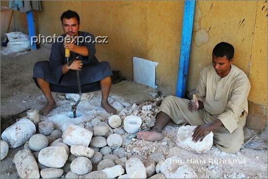 V oblasti Luxoru jsme navštívili i manufakturu a obchod s alabastrovými výrobky a výrobky z dalších kamenů (čedič, žula...). Nesměla samozřejmě chybět ukázka výroby: chlapík vlevo vrtá díru do alabastru, vpravo opracovává kámen kladívkem. Egypt