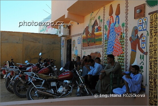 Před prodejnou alabastrových výrobků, kam nás zatáhl náš průvodce, u kýčovitě egyptskými motivy pomalované stěny obchodu seděli tito muži a tyto motorky...:=) Smysl mi unikl. Každopádně pracovní nadšeni to nebylo :=) Oblast Luxoru, Egypt.
