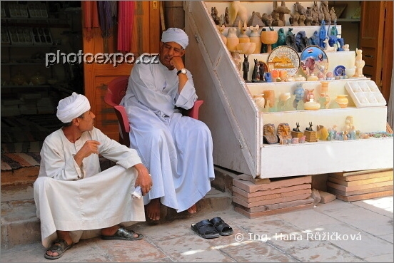 Hlavně se moc nepředřít... Egyptští prodavači u jednoho z mnoha stánků turistické tržnice, kterou jsme museli projít cestou k Hatšepsutinu chrámu. Egypt