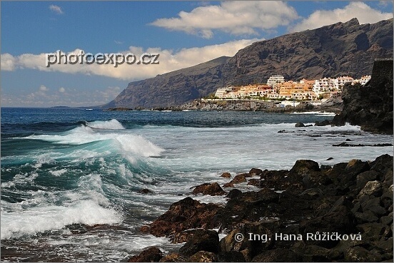 Atlantský oceán se opírá do tenerfiského pobřeží u Puerta de Santiago a Acantilago de los Gigantes. V pozadí jsou známé skály los Gigantes. Tenerife