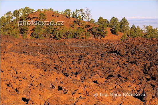 Silnice "utopená" v krajině plné ztuhlé lávy v Parque Nacional del Teide. Na lávě se zjevně daří piniovým borovicím. Tenerife