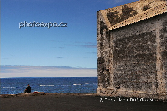 Úžasná náladová fotografie. Místní muž si užívá rybaření vedle chátrající budovy náležející k již nevyužívanému starému přístavu v městečku Garachico. Tenerife