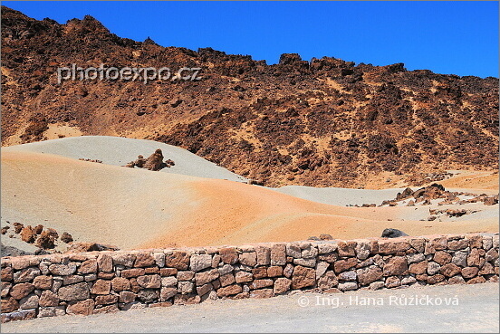 Fascinující písečné duny na pozadí hor ztuhlé lávy u vyhlídky Mirador de San José v Parque Nacional del Teide. Malá zídka lemuje silnici, která vede dunami. Tenerife