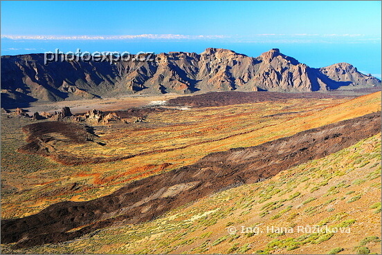 Fascinující lávová krajina Národního parku Teide pohledem z lanovky na Pico del Teide, nejvyšší vrchol Španělska. Krásně jsou viděl lávové splazy a hory lemující sopečný kráter. Tenerife