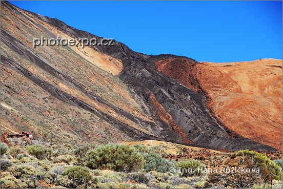 Detailnější pohled na různobarevné splazy a ztuhlou lávu u úpatí sopky Pico del Teide. Parque Nacional del Teide. Tenerife
